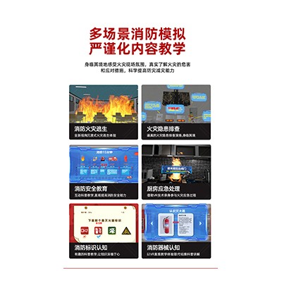 - 告别枯燥,互动性拉满:传统消防教育多以理论讲解、海报宣传、视频观看为主,内容枯燥乏味,缺乏互动性与体验感,难以调动学习积极性;而VR消防安全学习机借助虚拟现实技术,将火灾场景生动具象地呈现在用户眼前,让用户从“被动听讲”转变为“主动参与”,大幅提升学习兴趣。