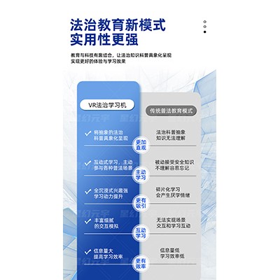VR法治学习机是一款深度融合前沿虚拟现实(VR)技术与体系化法律知识的智能教育产品。它不是普法工具,更是法治实践的全新平台。该产品致力于突破传统法治教育的时空与形式限制,通过营造沉浸式、可交互的虚拟法律环境,让学习者在“亲身经历”中理解法律原则、感受法律威严、掌握法律技能,从而扎实提升公民的法律素养与法治实践能力,是推进法治社会建设的一项创新性解决方案。