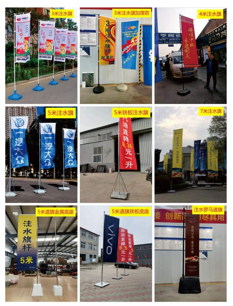 注水旗出租:提供 5 米注水旗杆租赁服务。3 米注水旗底座可注水 12 斤左右,底座轻巧,便于更换放置地点,配合可随风旋转的回旋头,可抗七级大风。旗杆高度可随意调节,横杆高度也能随旗面大小灵活调整,拆卸、更换方便快捷。