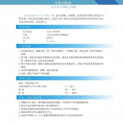 无泡皂洗剂ColTrit®HS-240C是马来酸、丙烯酸、表面活性剂聚合的高分子聚合物,具有优异的螯合能力,适用于棉、粘胶及其混纺织物染色和印花后皂洗,有非常优异的清洗、防沾能力。