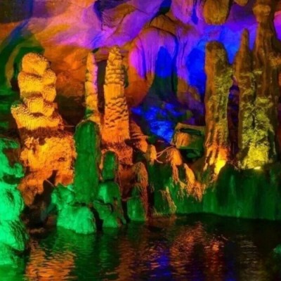 溶洞分为上洞、中洞、大洞、水洞和天洞,洞中有水、洞洞相连,漫步其中,流动的光影映照在林立的石景上,如梦如幻,仿佛闯入了隐秘的仙境。